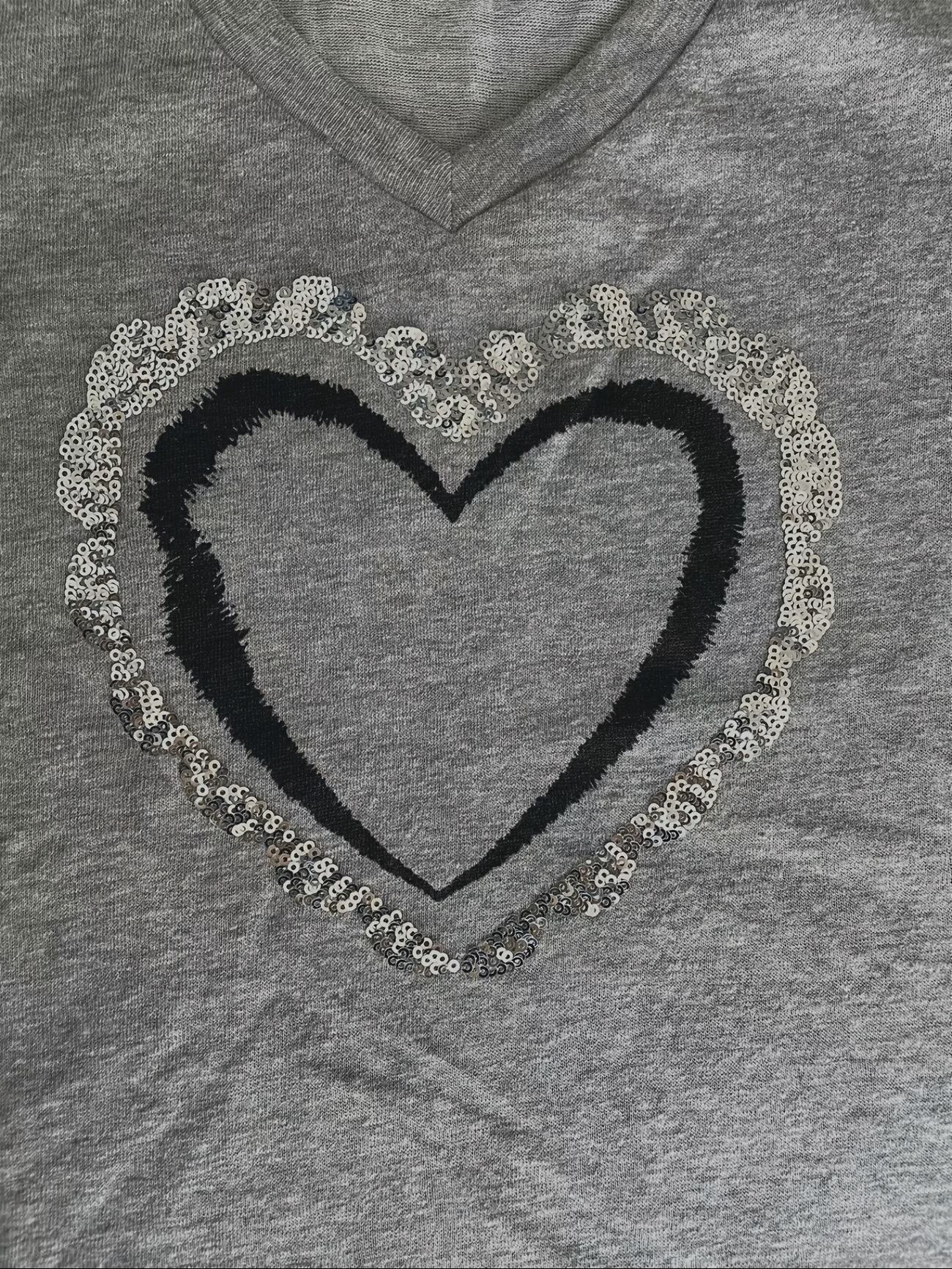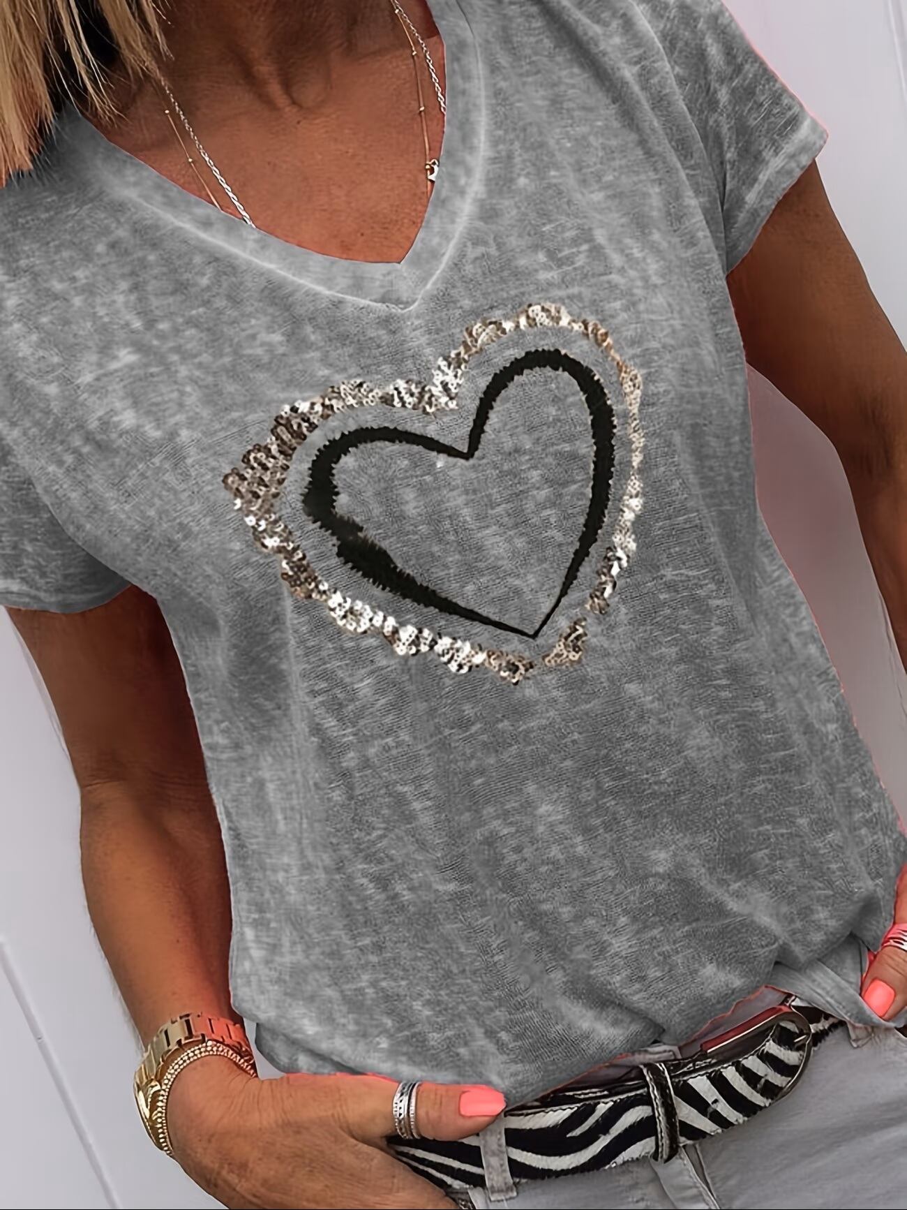 【送料無料】夏用Vネック半袖Tシャツ ハート&ビーズパッチ付き - ビーチウェアや日常着に最適なカジュアルブラウス - 洗濯機対応Vネックトップ (ノン-) - 適度な伸縮性フィット - 刺繍入り夏カジュアル K03315