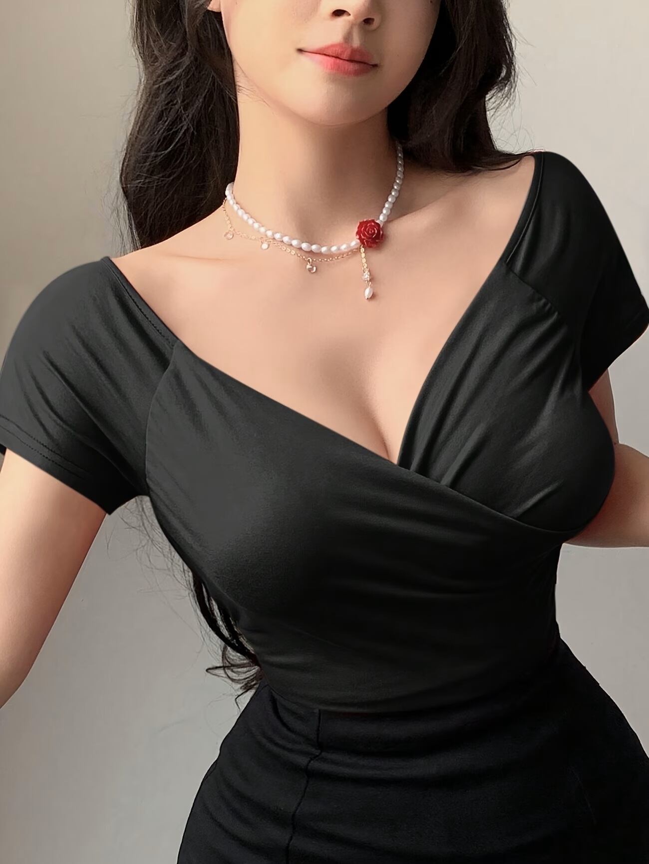 エレガントな無地VネックTシャツが新登場!背面のクロスディテールが優雅さを引き立て、カジュアルからフォーマルまで幅広く活躍するアイテムです。春、夏、秋にちょうどよいフィット感を持つ半袖デザインで、快適な着心地を実現します。シンプルでありながらも、スタイリッシュな雰囲気を演出し、デニムやスカートと合わせて様々なおしゃれを楽しむことができます。