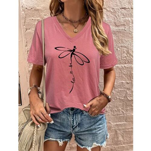 【送料無料】レディース トンボ&「Let It Be」アニメレタリング VネックTシャツ - 半袖ブラウス、ゆったりフィット カジュアル 春夏秋用 トンボ&「Let It Be」プリント、洗濯機対応 ブランチ・ショッピング・お出かけ用カジュアルウェア K03340