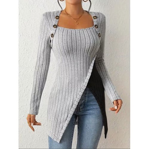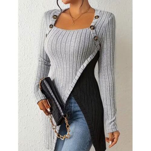 【送料無料】レディース エレガント アシンメトリー ボタンフロント スクエアネック ブラウス - ロングスリーブ カラーブロック トップ、洗濯機対応 オールシーズン パーティー用 ミディアムストレッチ レギュラーフィット (対称的なヒップ/脚を持つ方向け) K03385