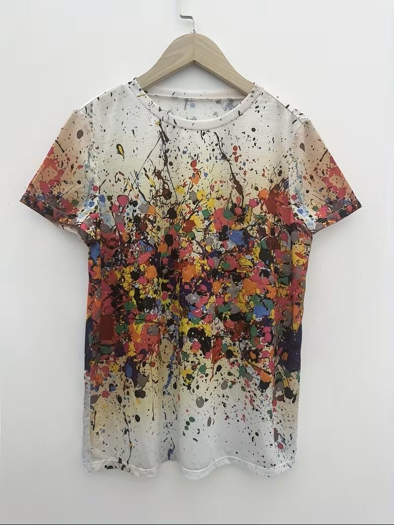 【送料無料】カラフル抽象柄クルーネックTシャツ カジュアル 半袖トップス 春夏用 レディースウェア K03388