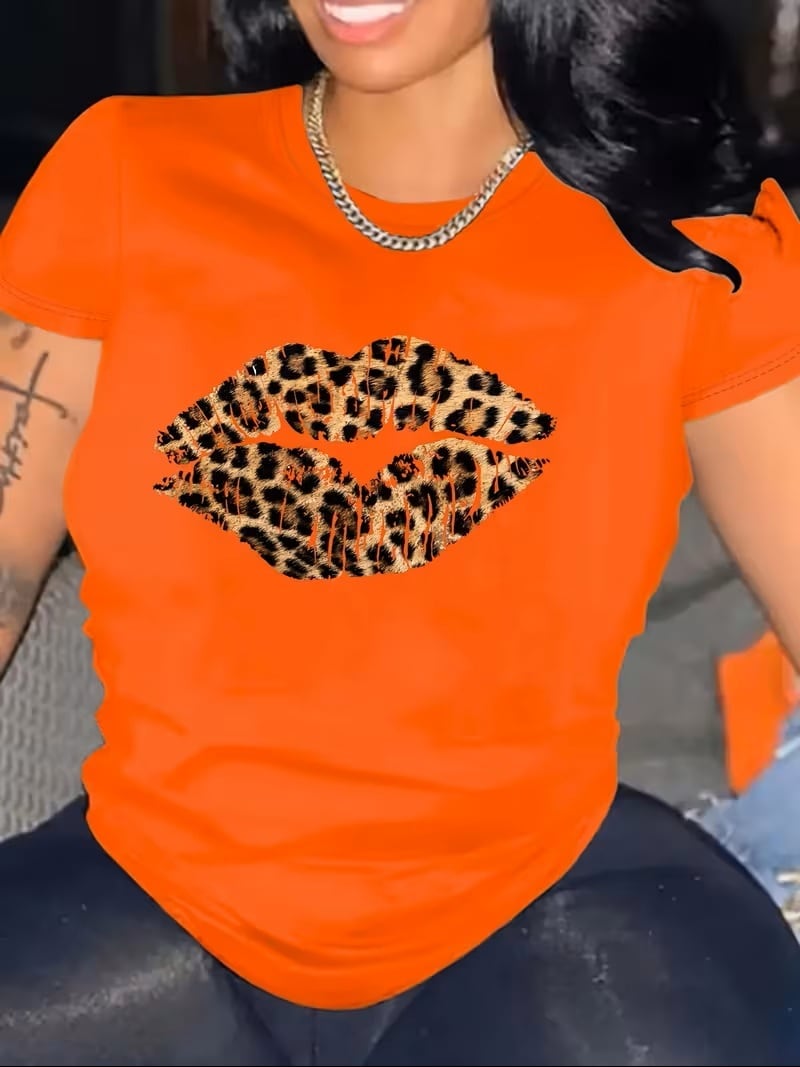 【送料無料】おしゃれなレオパード柄リップグラフィック + 半袖 + ラウンドネック Tシャツ K03414