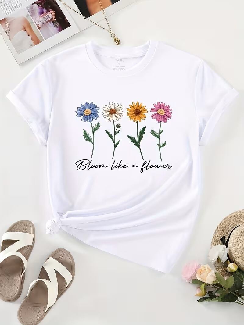 【送料無料】春夏にぴったりの可愛い花柄と文字プリントのカジュアルTシャツ、クルーネックの半袖トップス、女性用の服 K03423