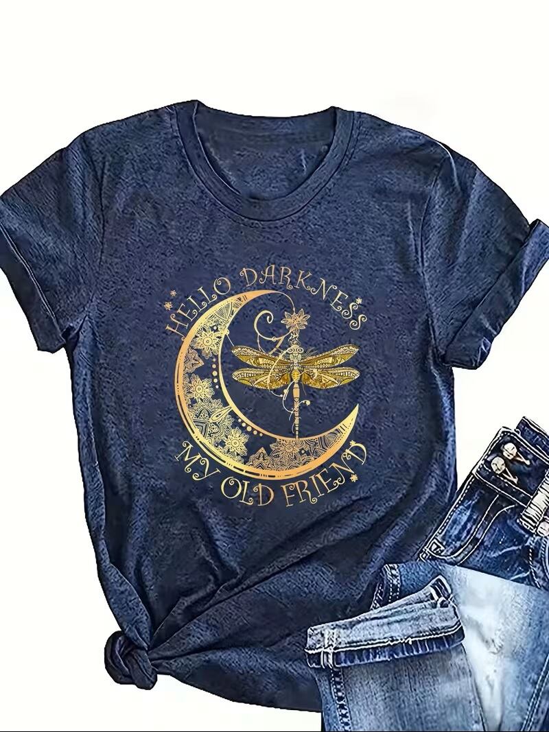 【送料無料】ムーン&グラゴンフライプリントクルーネックTシャツ、春夏用のカジュアルな半袖Tシャツ、女性用の服。 K03425