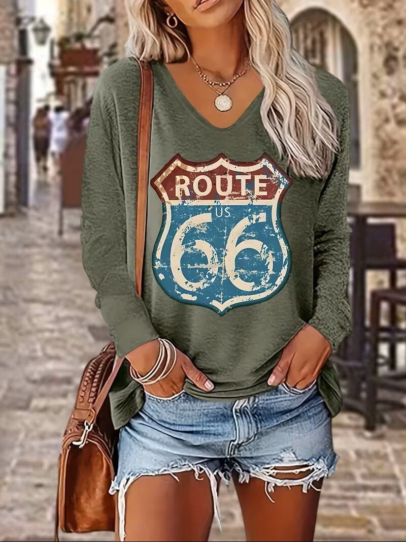 【送料無料】ヴィンテージ柄プリント 春秋冬用 レディース 100%トレンディファッション Vネック カラー長袖Tシャツ カジュアル バケーション ストリートスタイル 通気性 ルーズ ソフトで快適なデザイン お出かけやパーティーに最適 49-A81-70825 K03430
