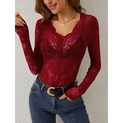 【送料無料】カットアウトレース スカルップ Vネック Tシャツ、春秋用カジュアルロングスリーブトップ レディース服 K03458
