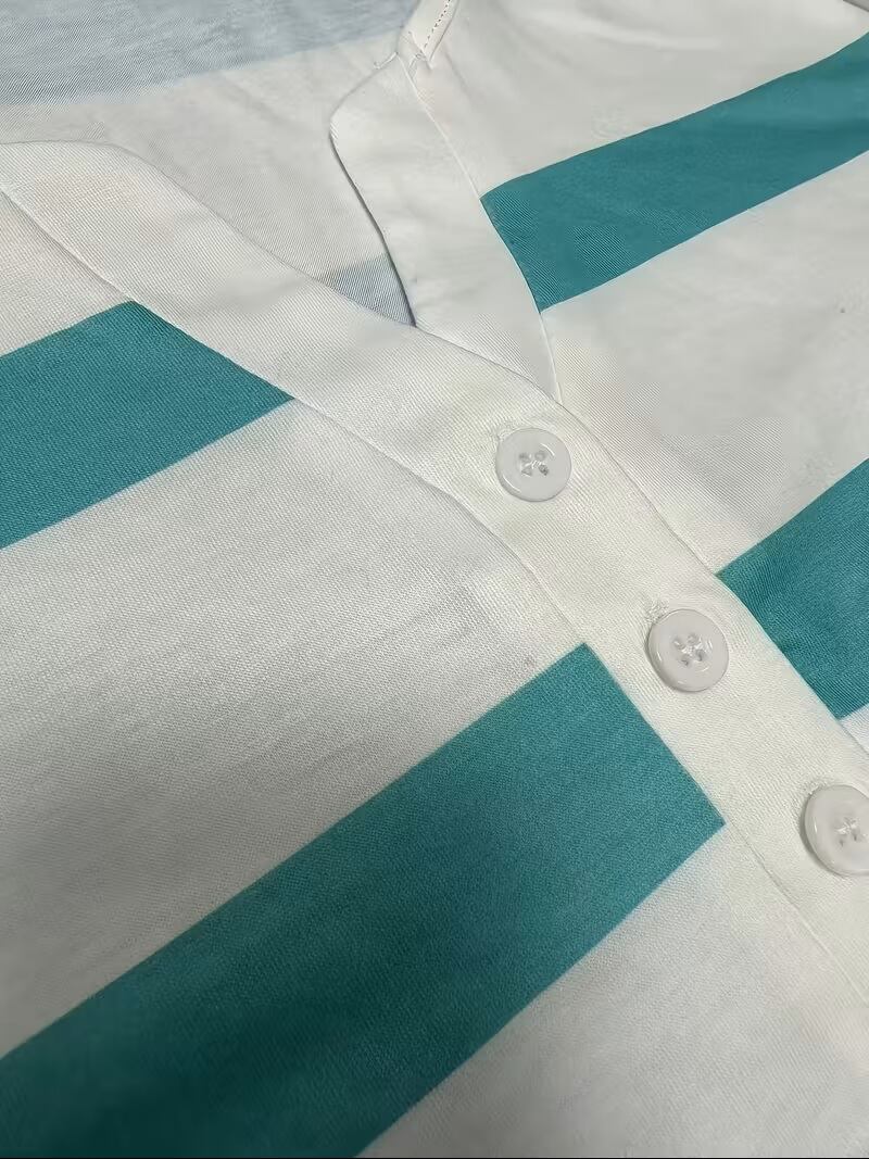【送料無料】カジュアルでスタイリッシュなホリデー レディース レギュラーフィット ストライプ柄プリント 7分袖 Vネック ボタンTシャツ K03450