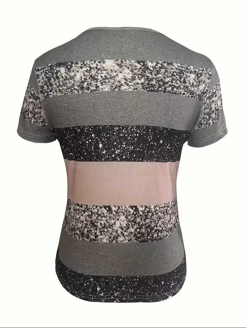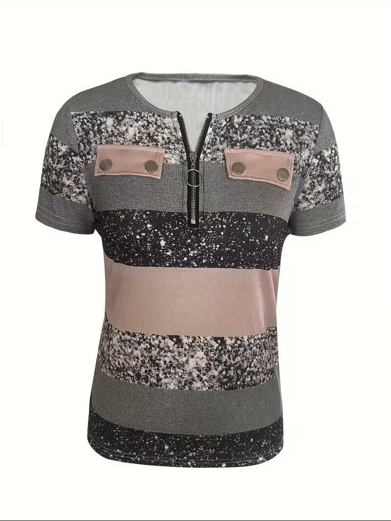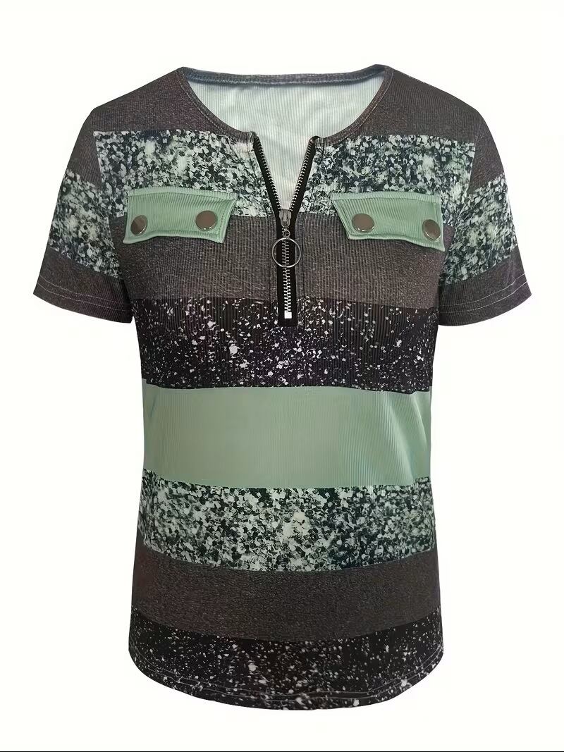 新作!おしゃれな欧米風デザインのVネックコントラストプリントスリムフィットジップアッププルオーバーTシャツが登場しました。スタイリッシュなコントラストプリントが目を引き、シルエットはスリムフィットなので、より一層スマートな印象を与えます。ジップアップデザインは、着脱が容易で、カジュアルでもきちんと感を演出。
