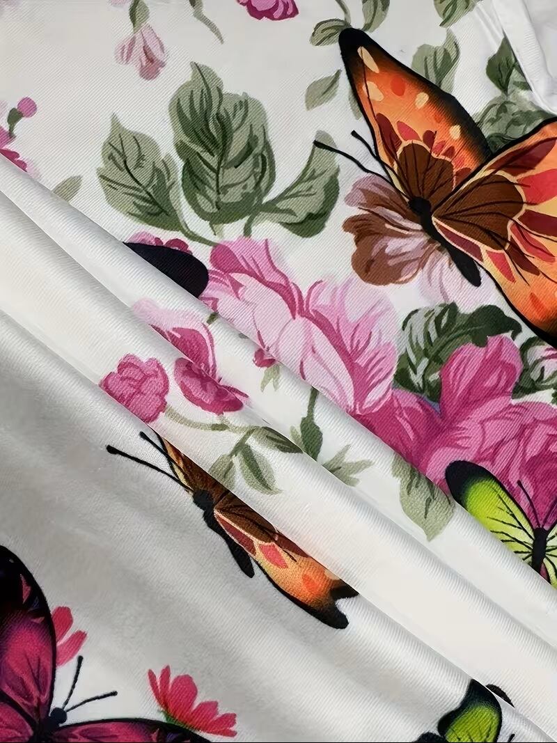【送料無料】エレガントなレディース半袖Tシャツ、レースパッチワーク、スタイリッシュでカラフルな花柄バタフライプリント K03482