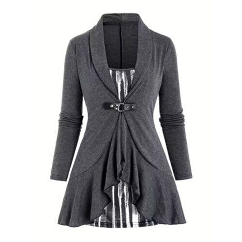 【送料無料】【レディース】長袖 フェイクツーピース トップス ラッフルヘム & 花柄プリント、フルーツカラー & バックル付き K03531