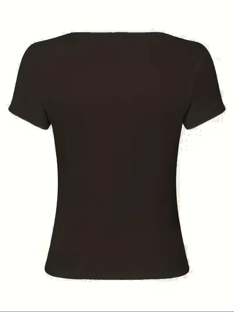 【送料無料】女性のエレガントなボタンフロントTシャツ、ゴールデンなボタンデタイル - 通気性のある半袖ラウンドネックトップ、軽量な素材、フェイクポケット、夏のオフィスやデートナイトのアウトフィットに最適、カジュアルなシックなスタイル、デートナイトのアウトフィット、装飾的なフロントボタン、快適なフィット K03530