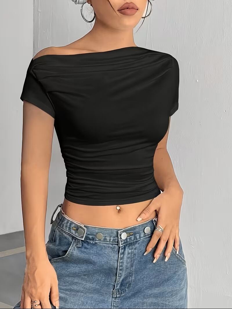 春夏のスタイルにぴったりな「女性用春/夏用ショートTシャツ、不規則な肩とフレアヘム」。ユニークな不規則な肩デザインが、個性的でありながら上品な印象を与えます。ふんわりとしたフレアヘムが特徴的で、動くたびに軽やかさを演出。高品質な素材を使用し、優れた通気性と柔らかさを持つため、快適な着心地を保ちつつ、春から夏にかけて重宝する一枚です。