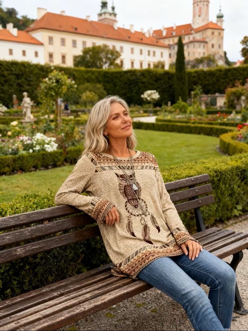 【送料無料】レディース プリント ラウンドネック ウェスタンスタイル ラグランスリーブ ルーズTシャツトップ K03553