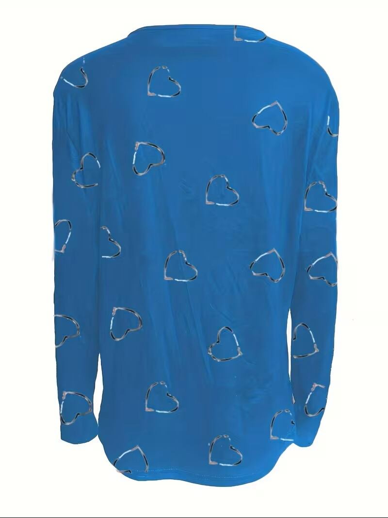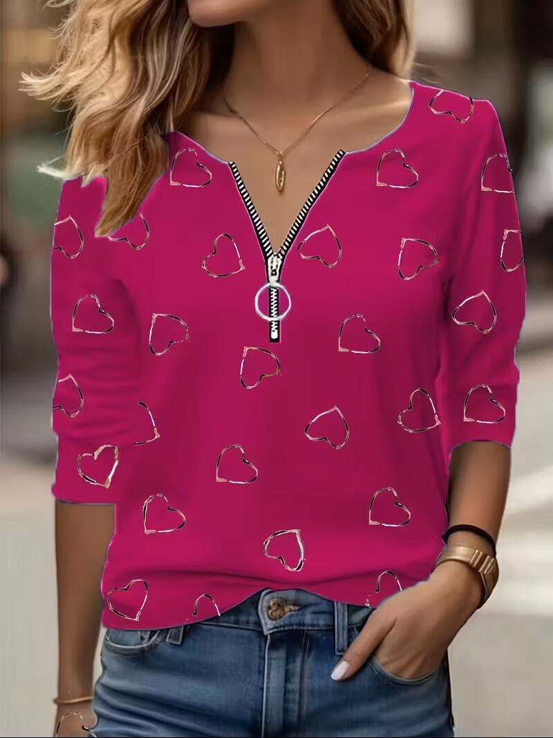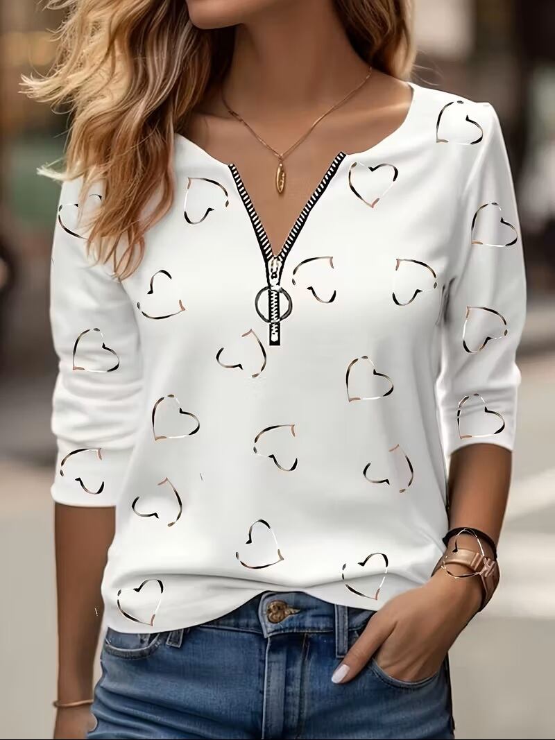【送料無料】【2024年新作】レディース カジュアル ハート柄 長袖 Vネック ジッパー Tシャツ K03570