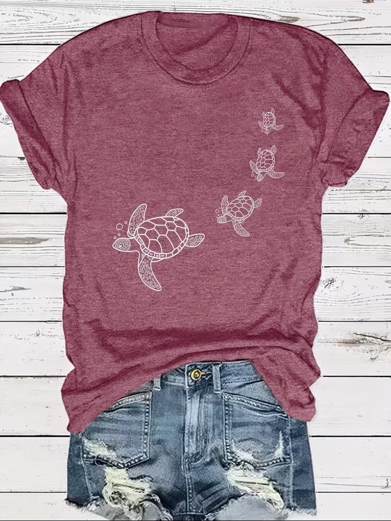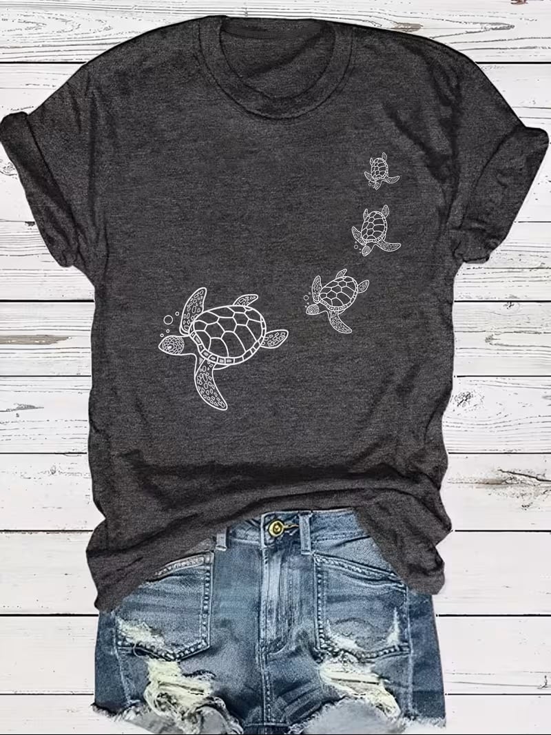 【送料無料】カメ柄プリントTシャツ, レディースファッションTシャツ, 女性へのギフト, 半袖クルーネックTシャツ K03590