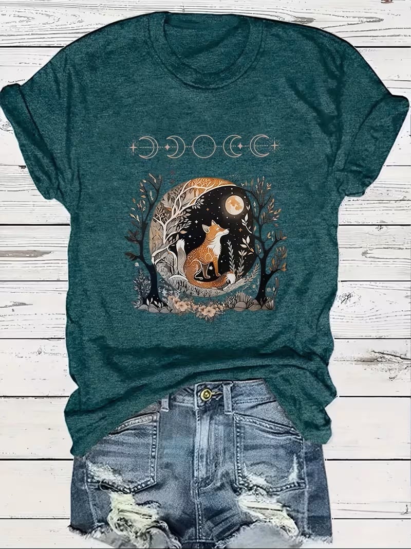 【送料無料】ムーン&フォックスプリントクルーネックTシャツ、春夏用のカジュアルな半袖Tシャツ、女性用衣料品 K03600