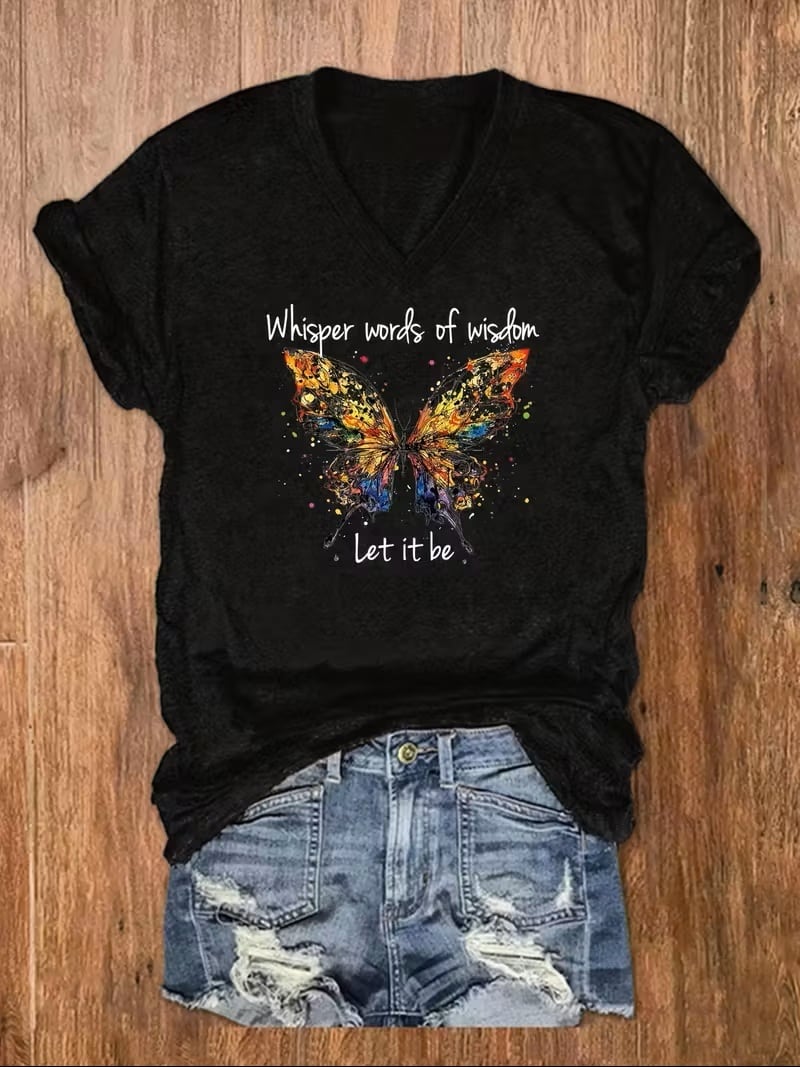 【送料無料】レター&バタフライプリントTシャツ Vネック半袖Tシャツ カジュアルデイリートップス 婦人服 K03603