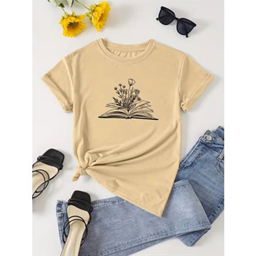 【送料無料】ブック&花柄クルーネックTシャツ、春夏カジュアル半袖Tシャツ、婦人服 K03611