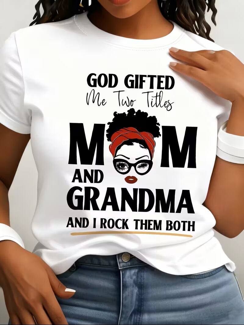 【送料無料】「God Gifted Me Two Titles Mom and Grandma」レタープリントのカジュアルなクルーネックTシャツ、100%ポリエステルニットファブリック、ショートスリーブトップ、全年間対応 - 180gsm K03621