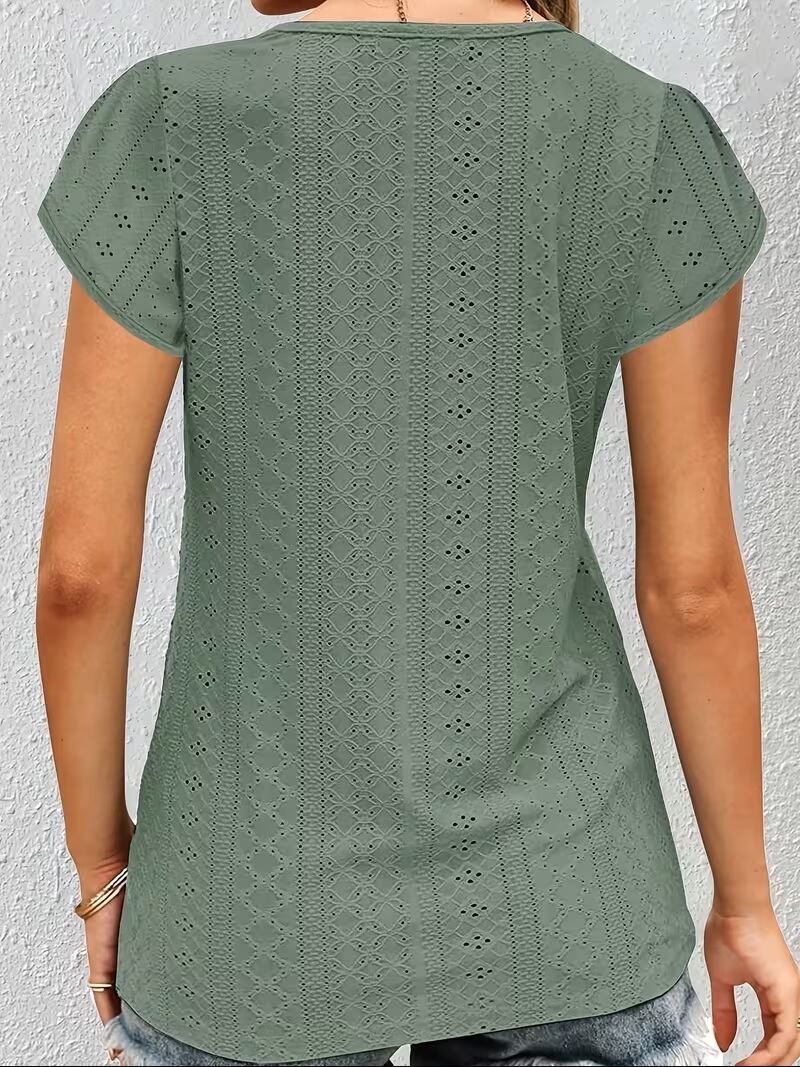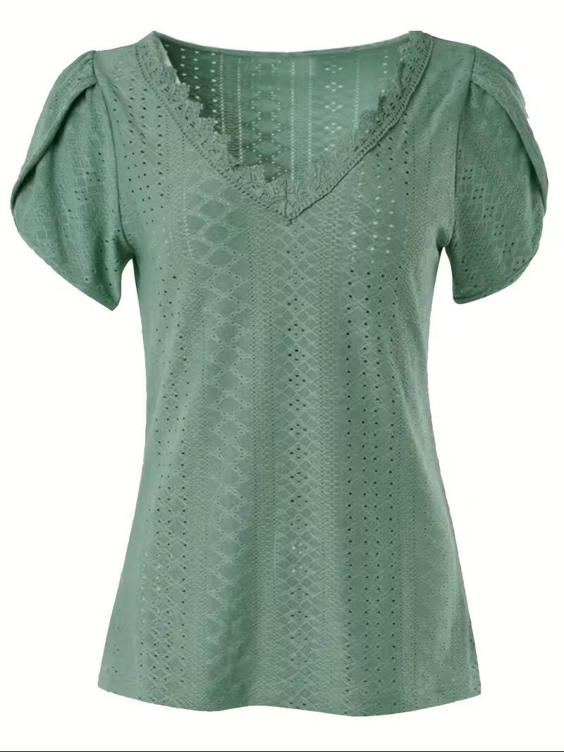 女性らしい魅力を引き立てる、繊細なレースが施されたVネックトップスです。軽やかな素材使いで、春夏のコーディネートにぴったり。深めのVネックデザインは、顔周りをすっきりと見せ、程よいフィット感が身体のラインを美しく見せます。デニムやスカートとも合わせやすく、日常使いからお出かけまで幅広いシーンでお楽しみいただけます。