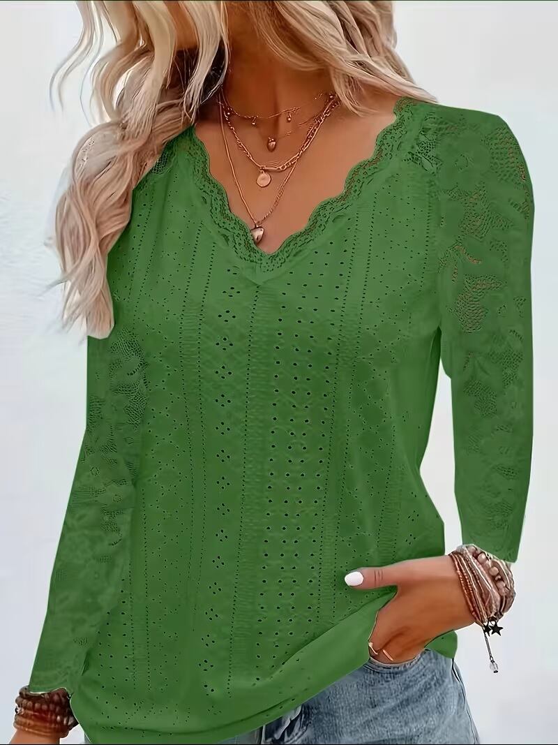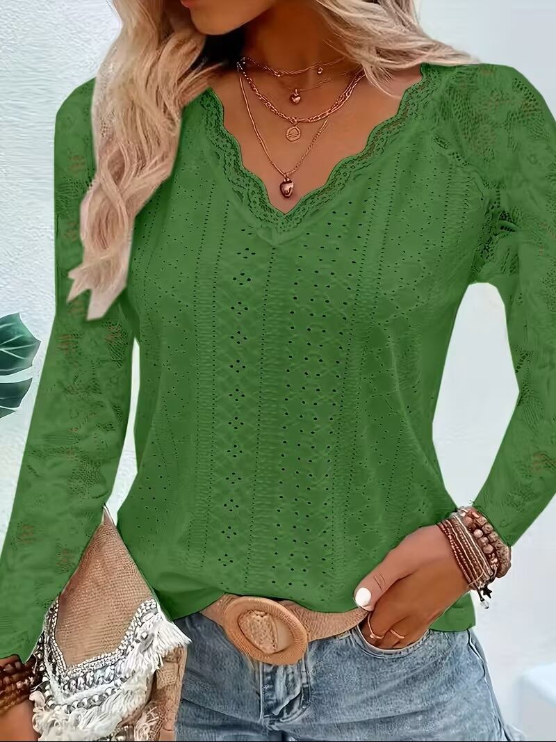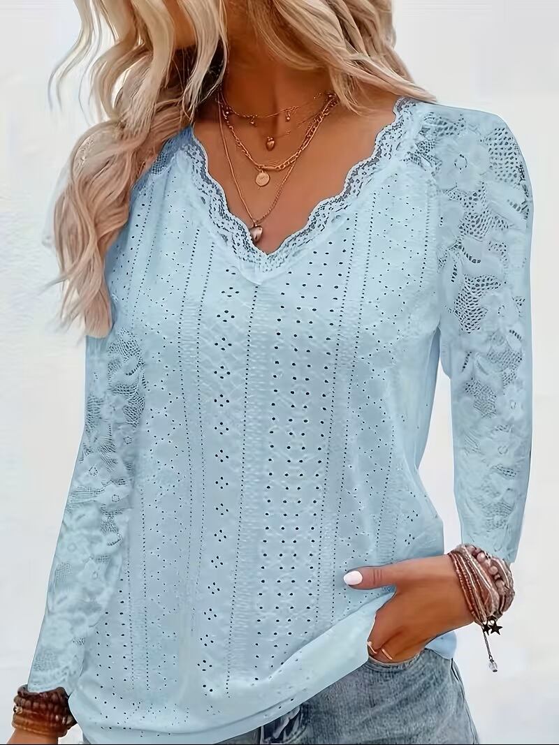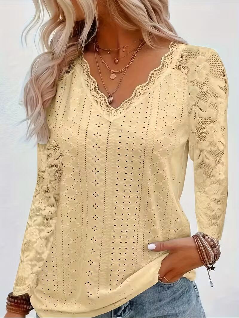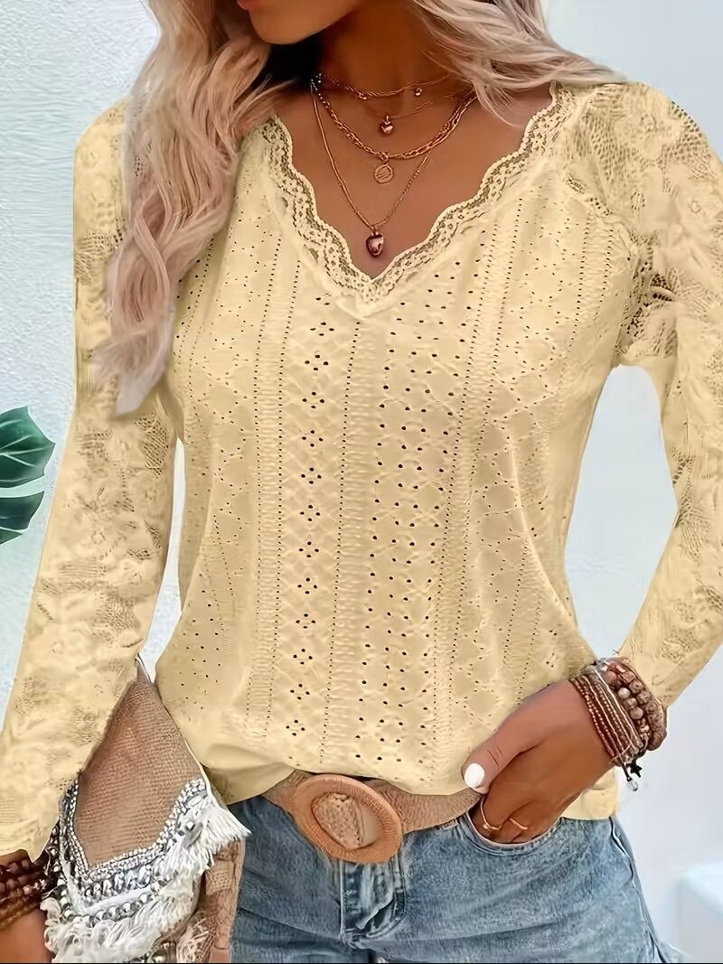 【送料無料】コントラストレースVネックアイレットTシャツ、春秋用エレガント長袖Tシャツ、婦人服 K03632