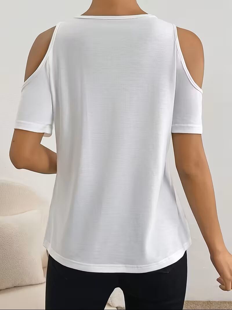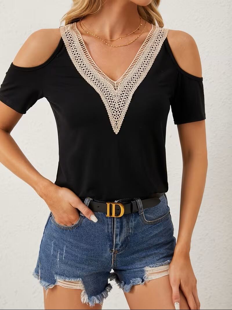 【送料無料】新作 レディース ゆったり 無地 Vネック Tシャツ エレガント レース 花柄アップリケ 半袖。着こなしやすいデザイン。 K03634