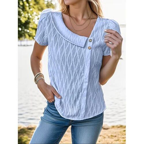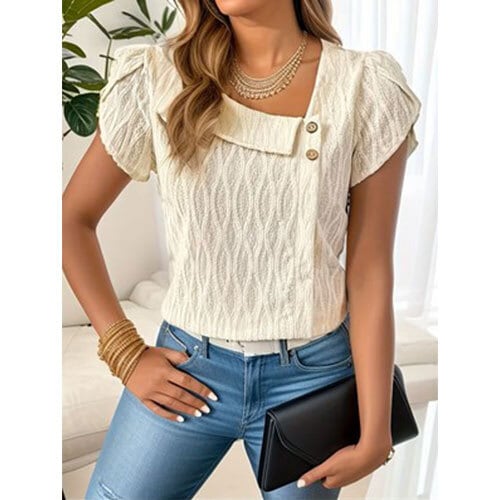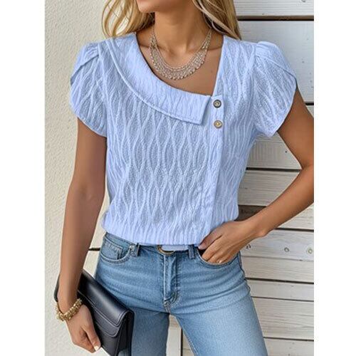【送料無料】エレガントな無地スラントカラーボタンペタルスリーブTシャツ レディース半袖トップ K03701