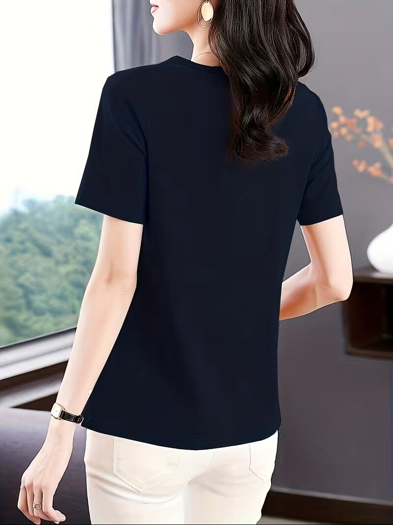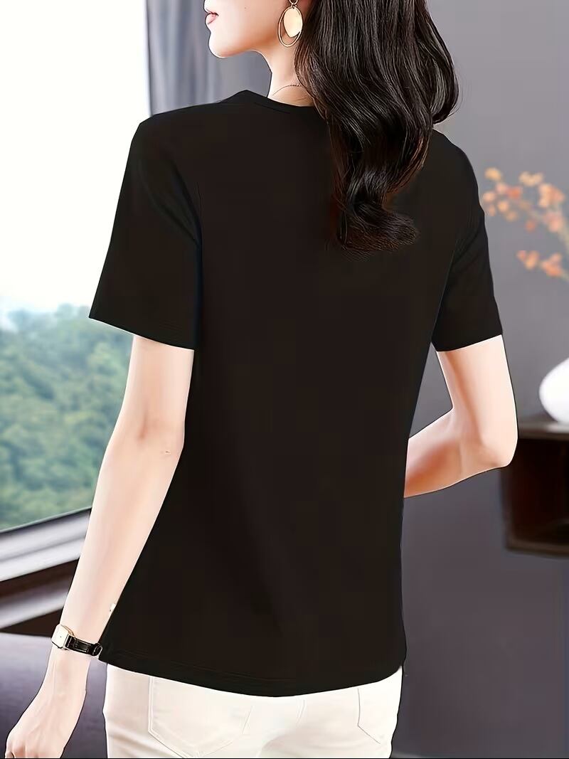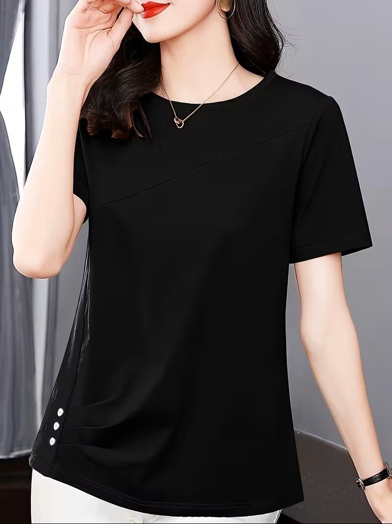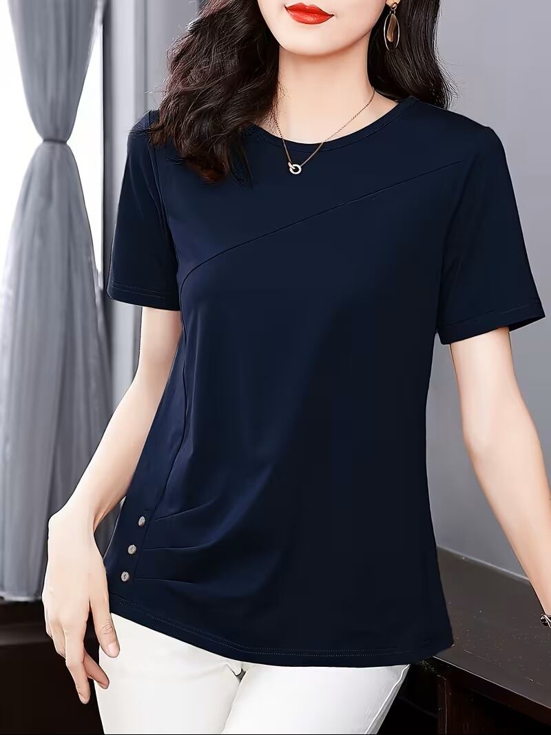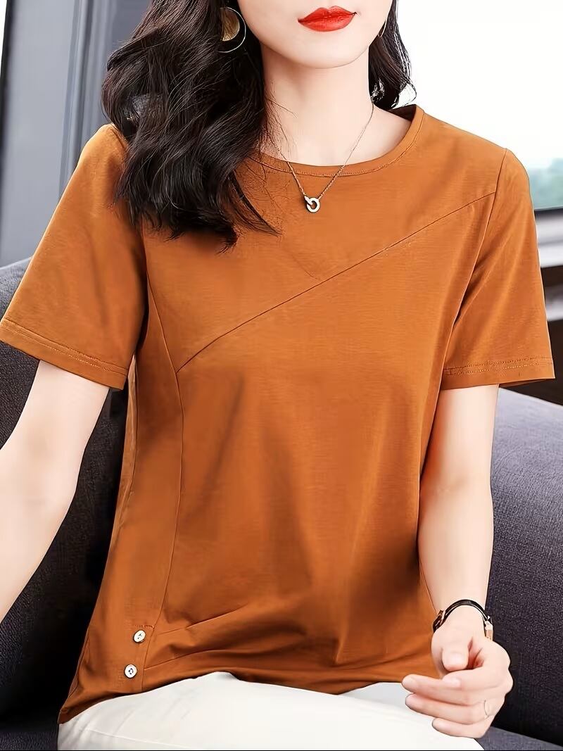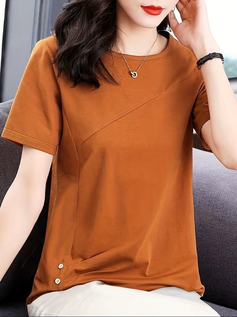 スタイリッシュでありながら、カジュアルな印象を演出する『レディース 無地 ラウンドネック 半袖 Tシャツ』。スプライシングデザインとサイドボタンが、シンプルながらも個性的なアクセントを加え、普段使いからオフィススタイルまで幅広く活躍します。肌触りが良く、軽やかな着心地を実現するクオリティの高い素材を使用しています。一枚で着るのはもちろん、重ね着にも最適な一着です。