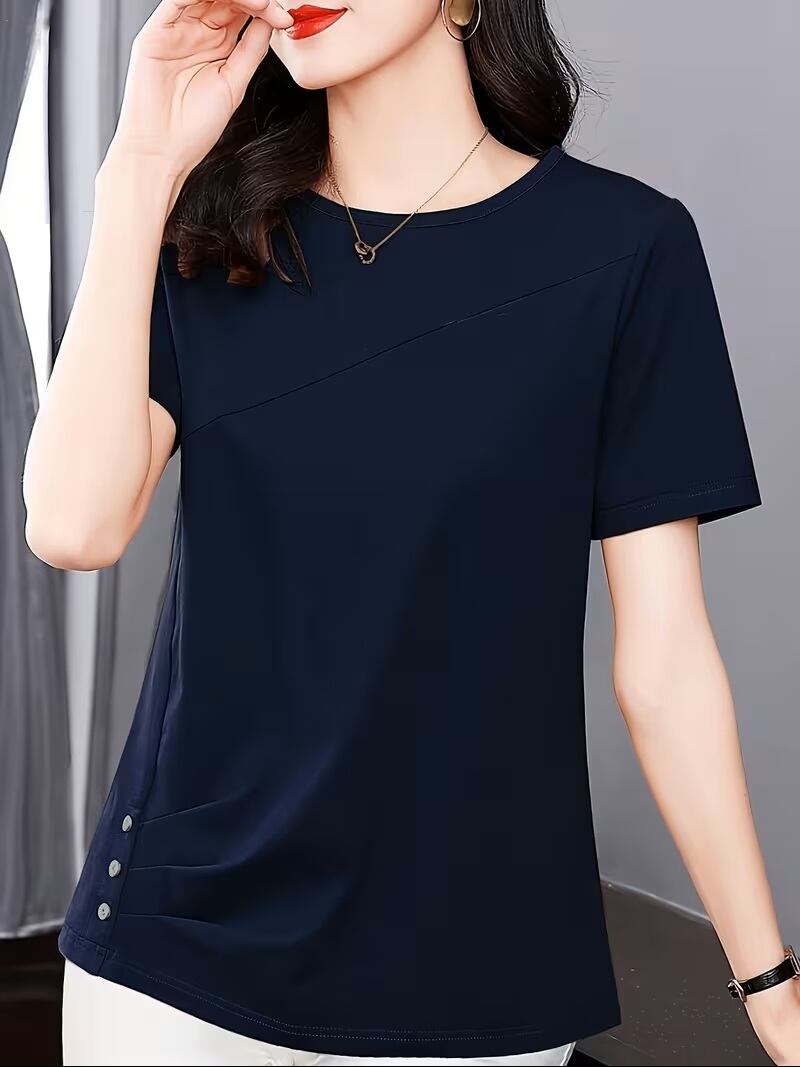 【送料無料】レディース 無地 ラウンドネック 半袖 Tシャツ、デザイン感 スプライシング サイドボタン トップ、レディース 半袖 Tシャツ、レディース トップ K03702