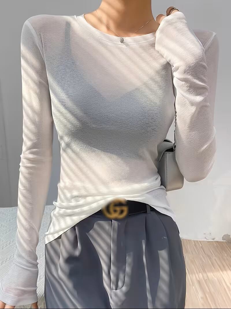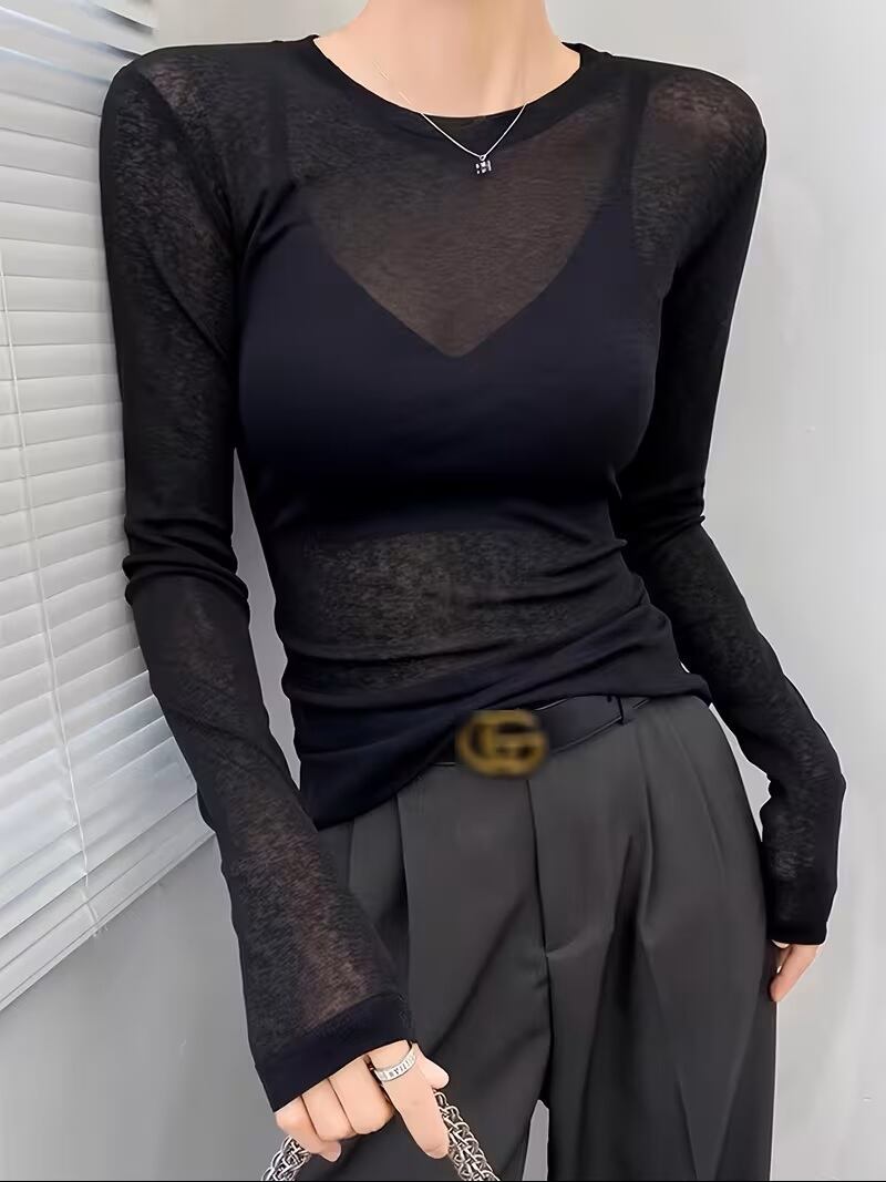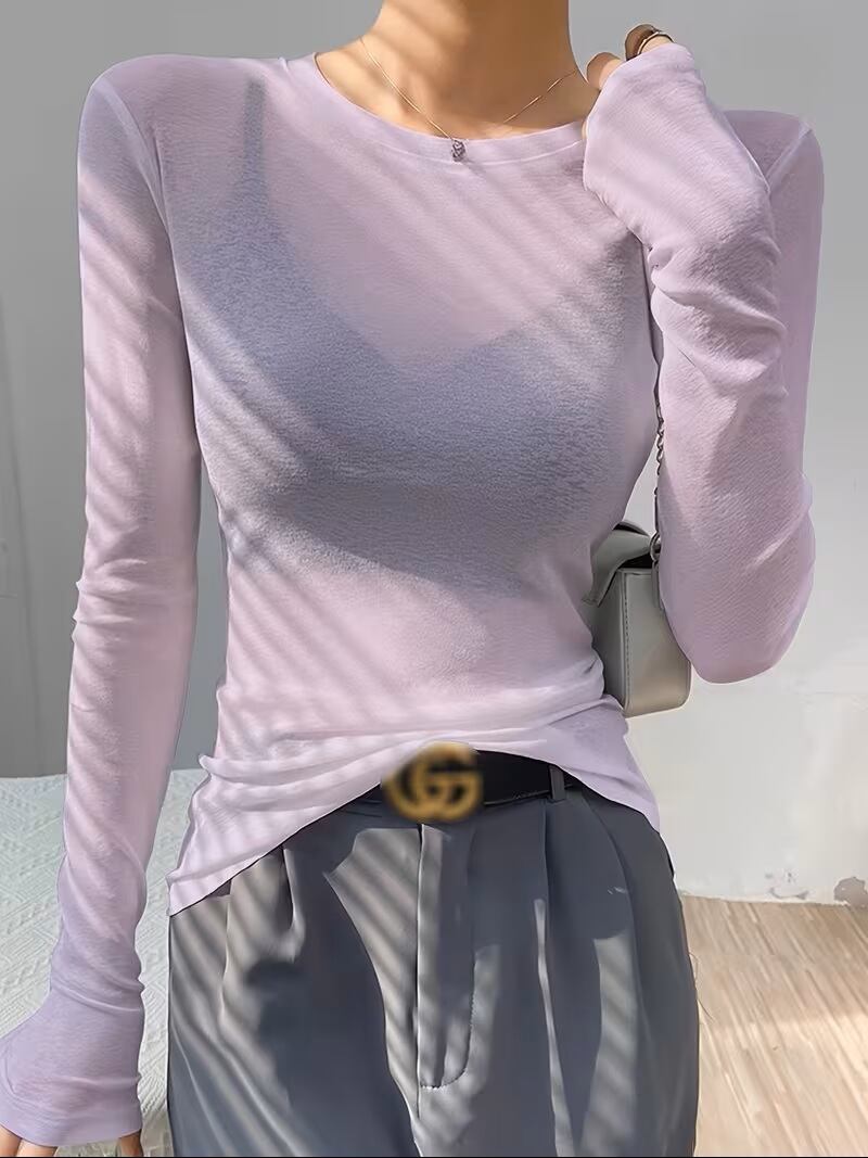 春夏にぴったりなレディース無地ベースレイヤートップスが登場!シースルーメッシュ仕様のブラウスは、軽やかで透け感のあるデザインが魅力で、カジュアルから少し女性らしいスタイルまで幅広く活躍するアイテムです。涼しげな着心地で、暖かい季節のコーディネートに最適な一枚です。