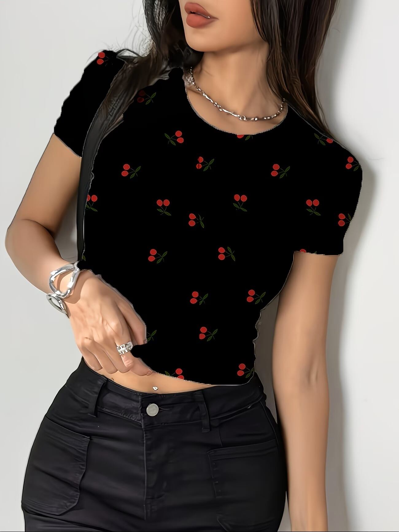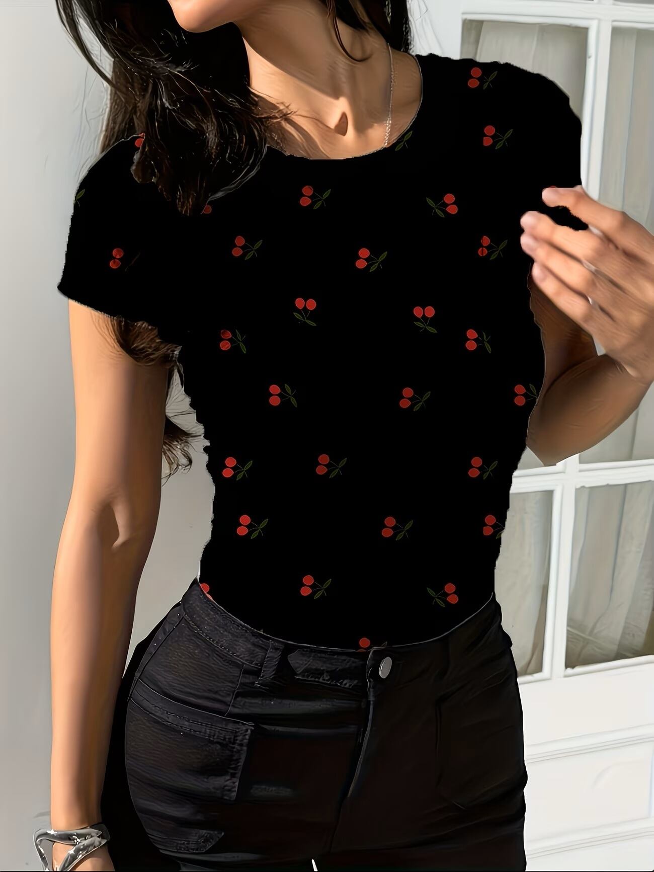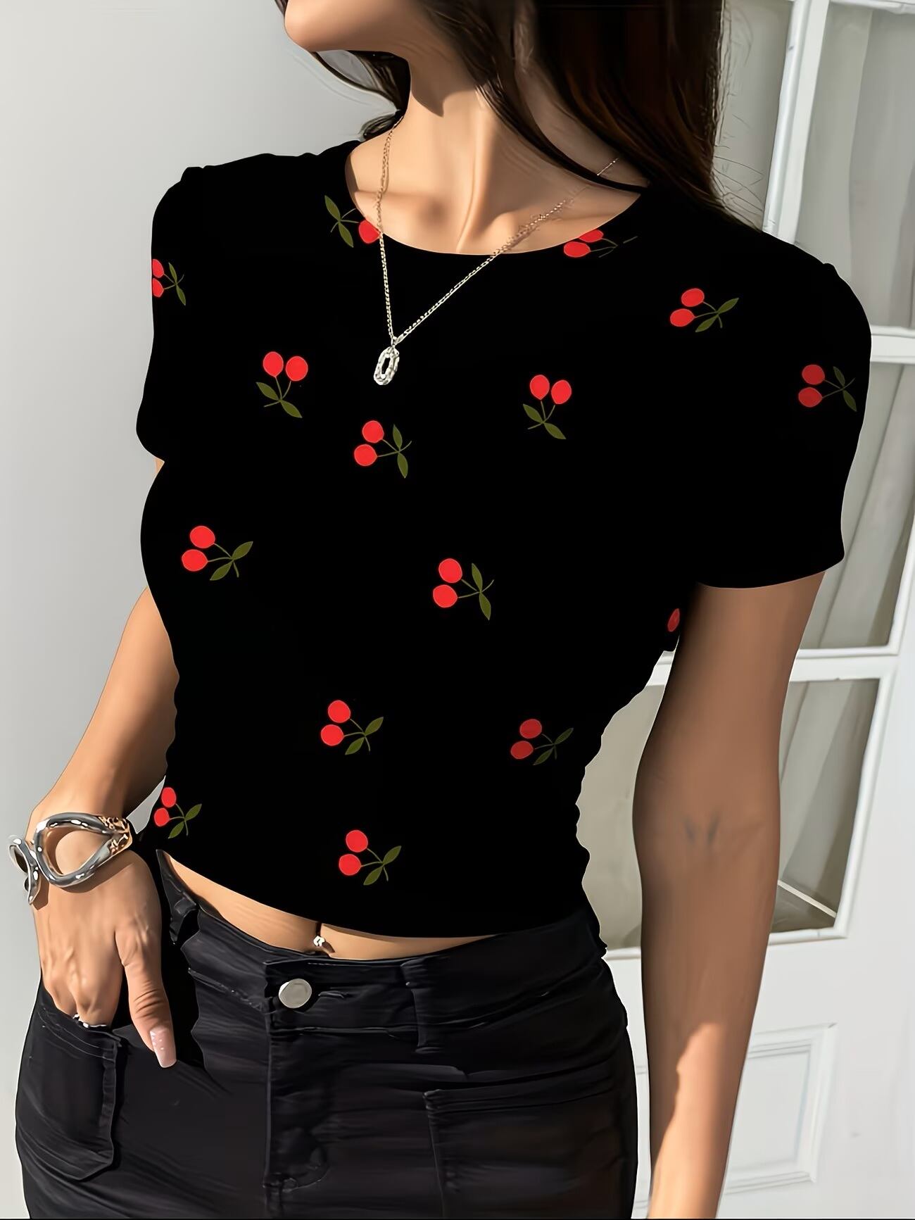 【送料無料】レディース Y2K スタイル ブラック ショートトップス、赤いチェリー柄 - カジュアル 半袖 Tシャツ、軽量、春夏秋に最適、カジュアルな夏服 | Y2K ファッション | 光沢のある質感、チェリー柄 レディース トップス、美しい レディース トップス K03724