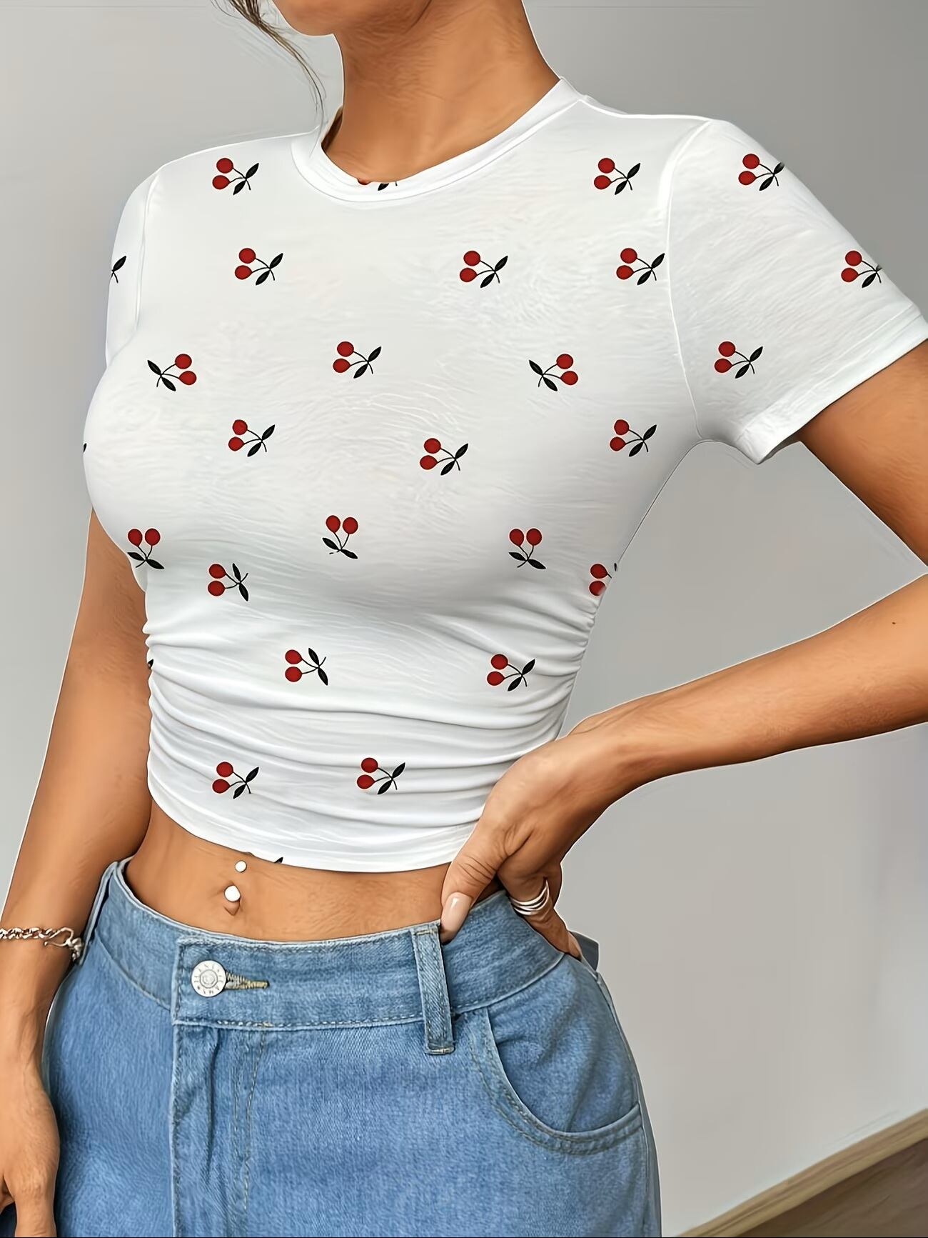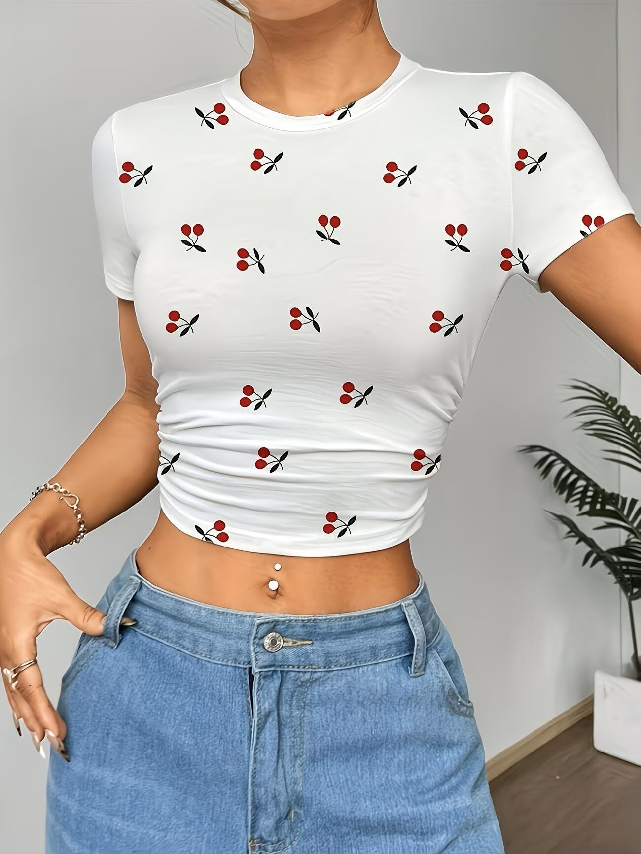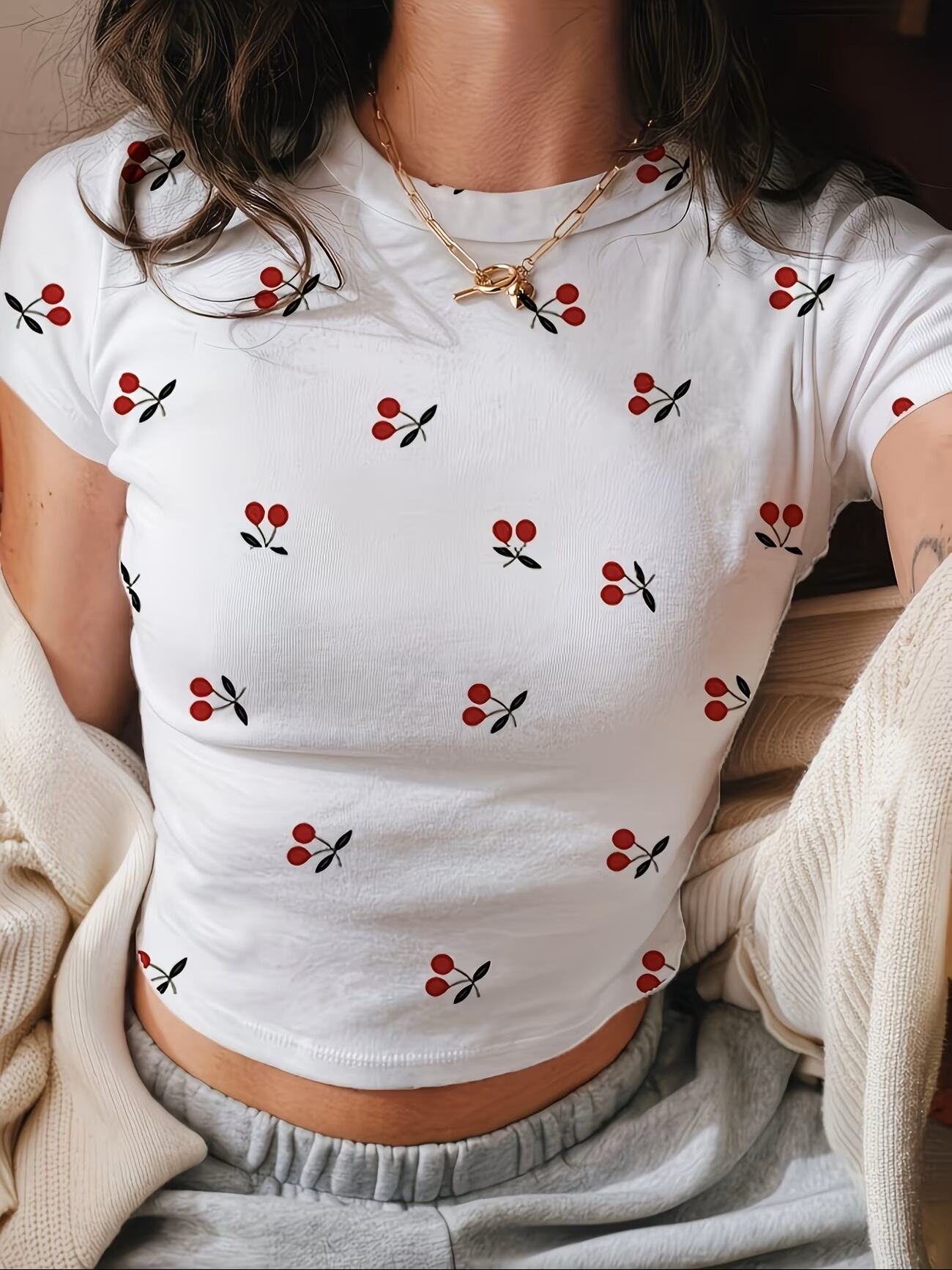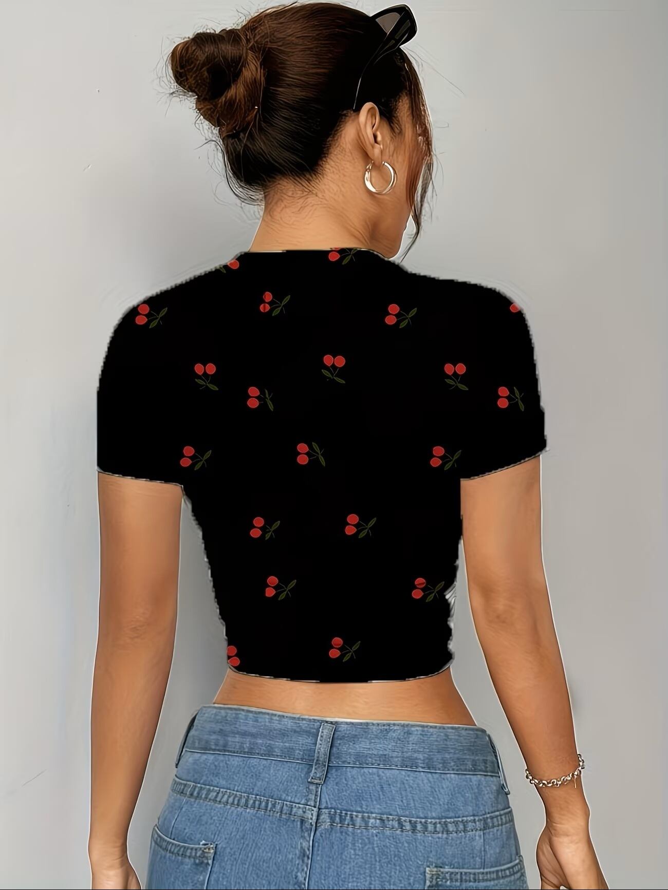 【送料無料】レディース Y2K スタイル ブラック ショートトップス、赤いチェリー柄 - カジュアル 半袖 Tシャツ、軽量、春夏秋に最適、カジュアルな夏服 | Y2K ファッション | 光沢のある質感、チェリー柄 レディース トップス、美しい レディース トップス K03724